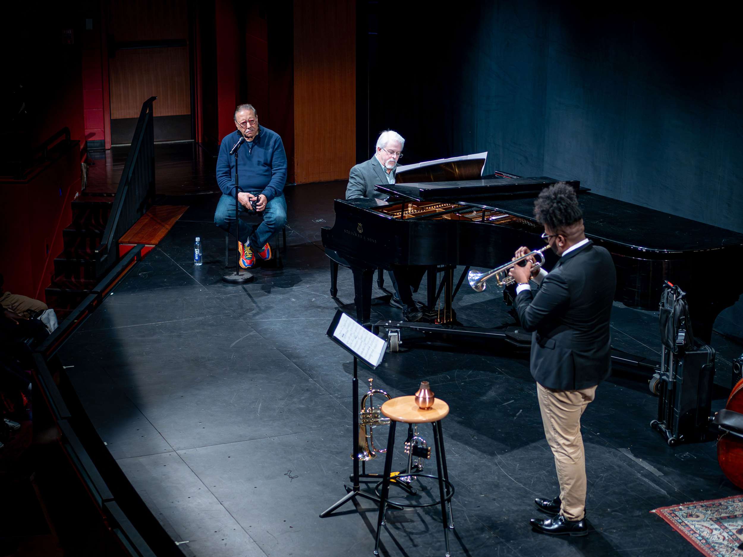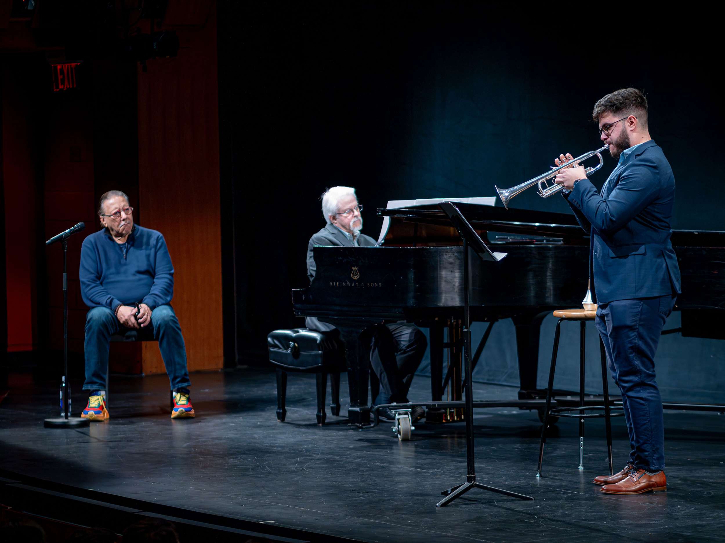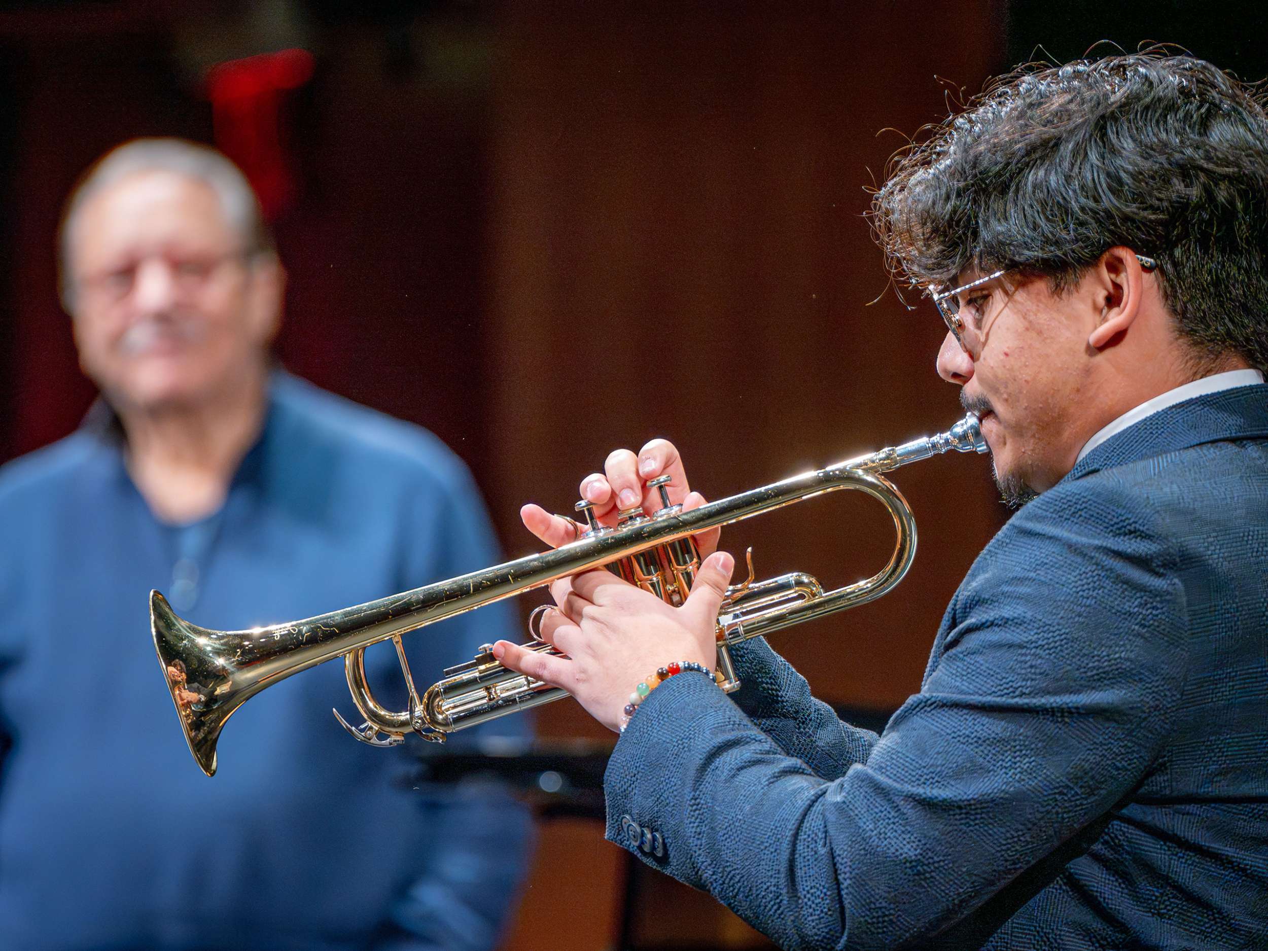 While the almost 500-seat theater was packed, he was truly playing for an audience of one: none other than Maestro Arturo Sandoval, one of the greatest trumpet players and composers to ever pick up the instrument. Sandoval’s presence was made possible through the John J. Cali School of Music’s Immersive Residency Program.