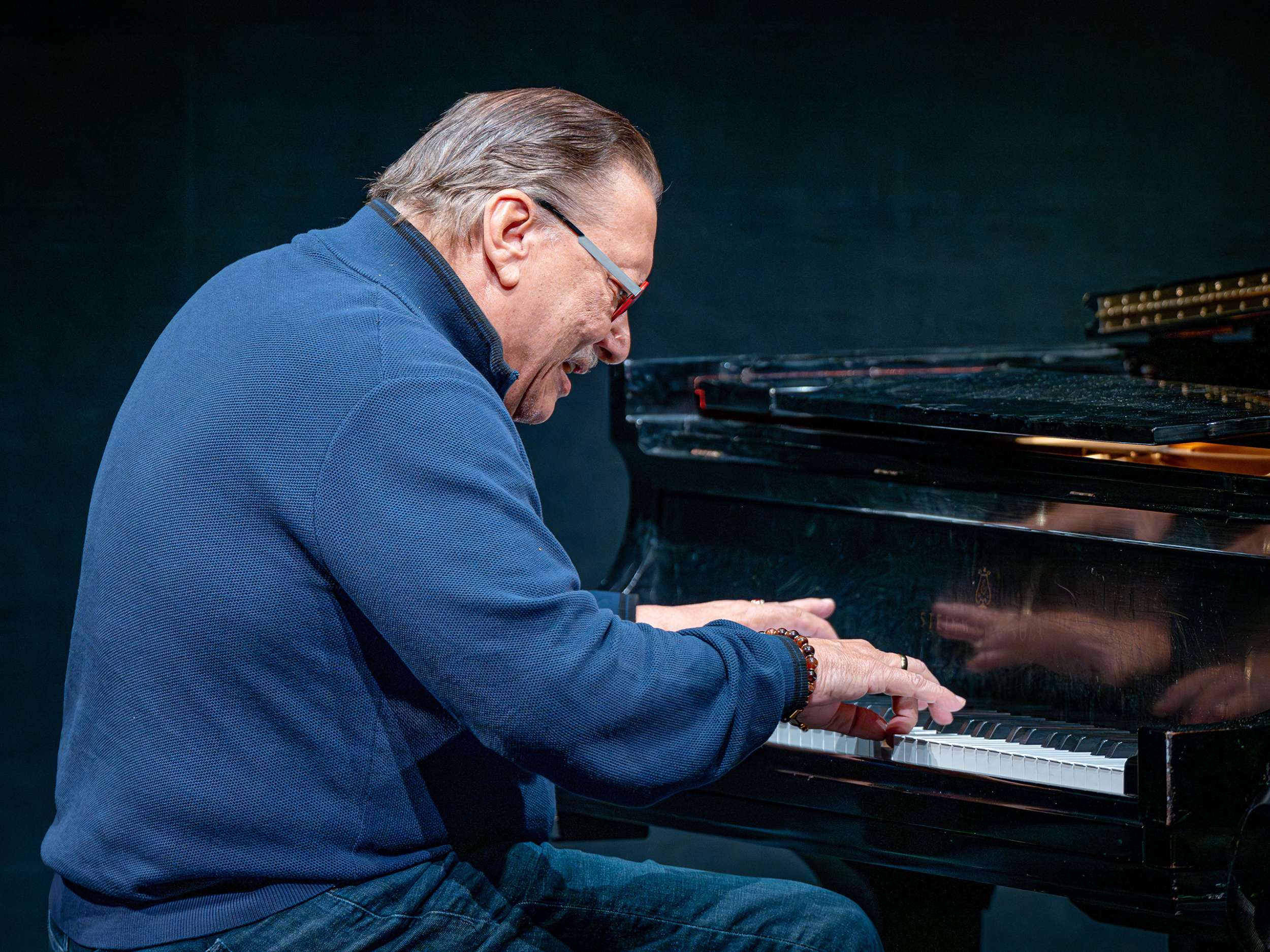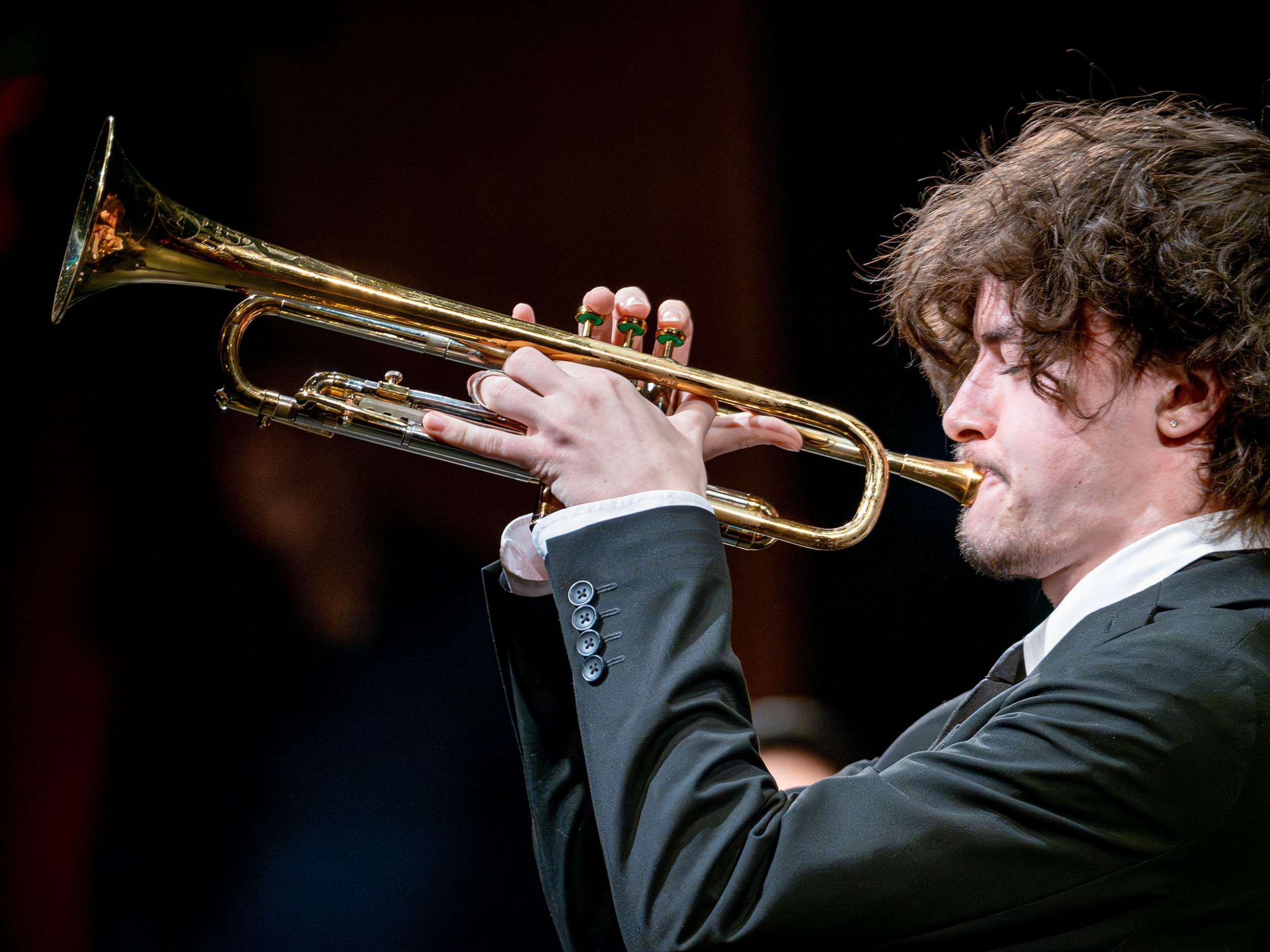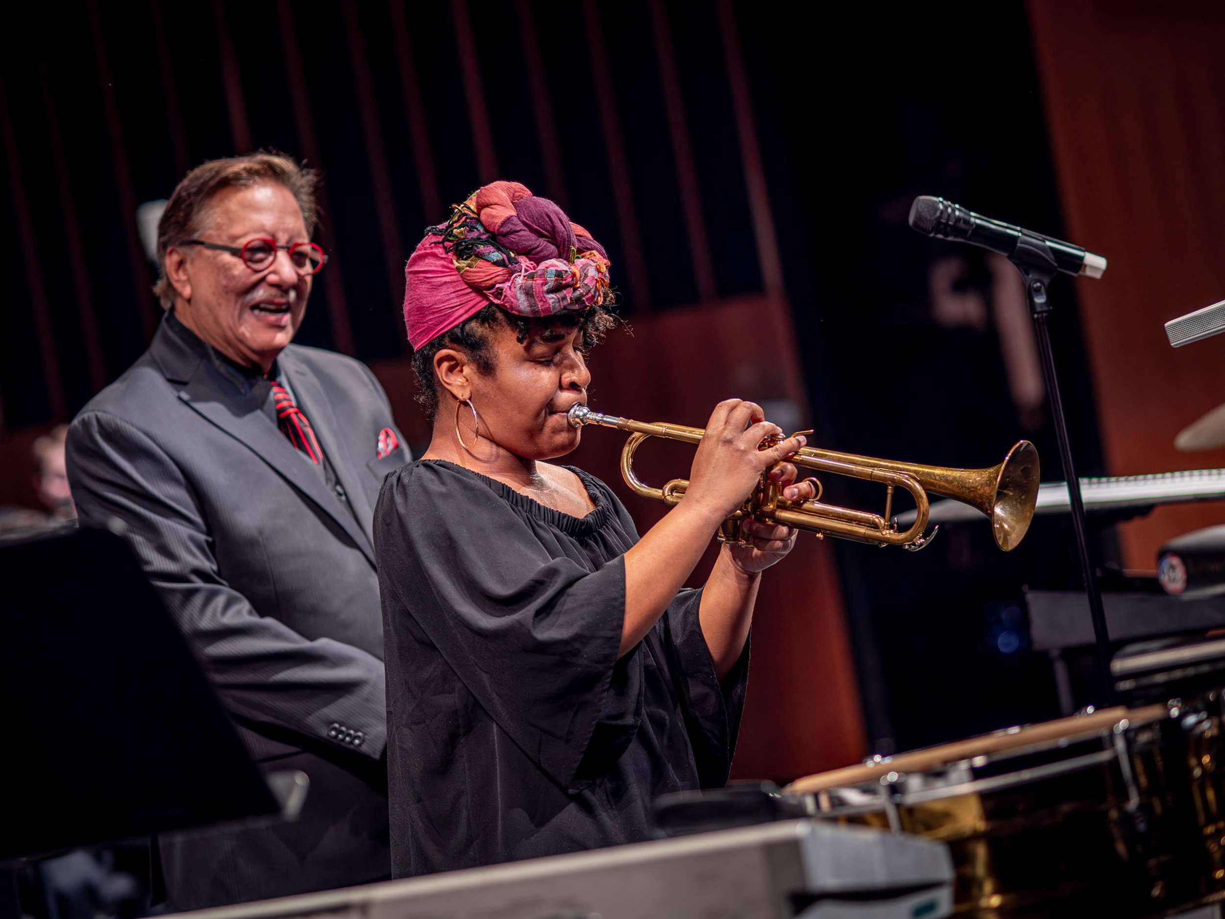 While the almost 500-seat theater was packed, he was truly playing for an audience of one: none other than Maestro Arturo Sandoval, one of the greatest trumpet players and composers to ever pick up the instrument. Sandoval’s presence was made possible through the John J. Cali School of Music’s Immersive Residency Program.