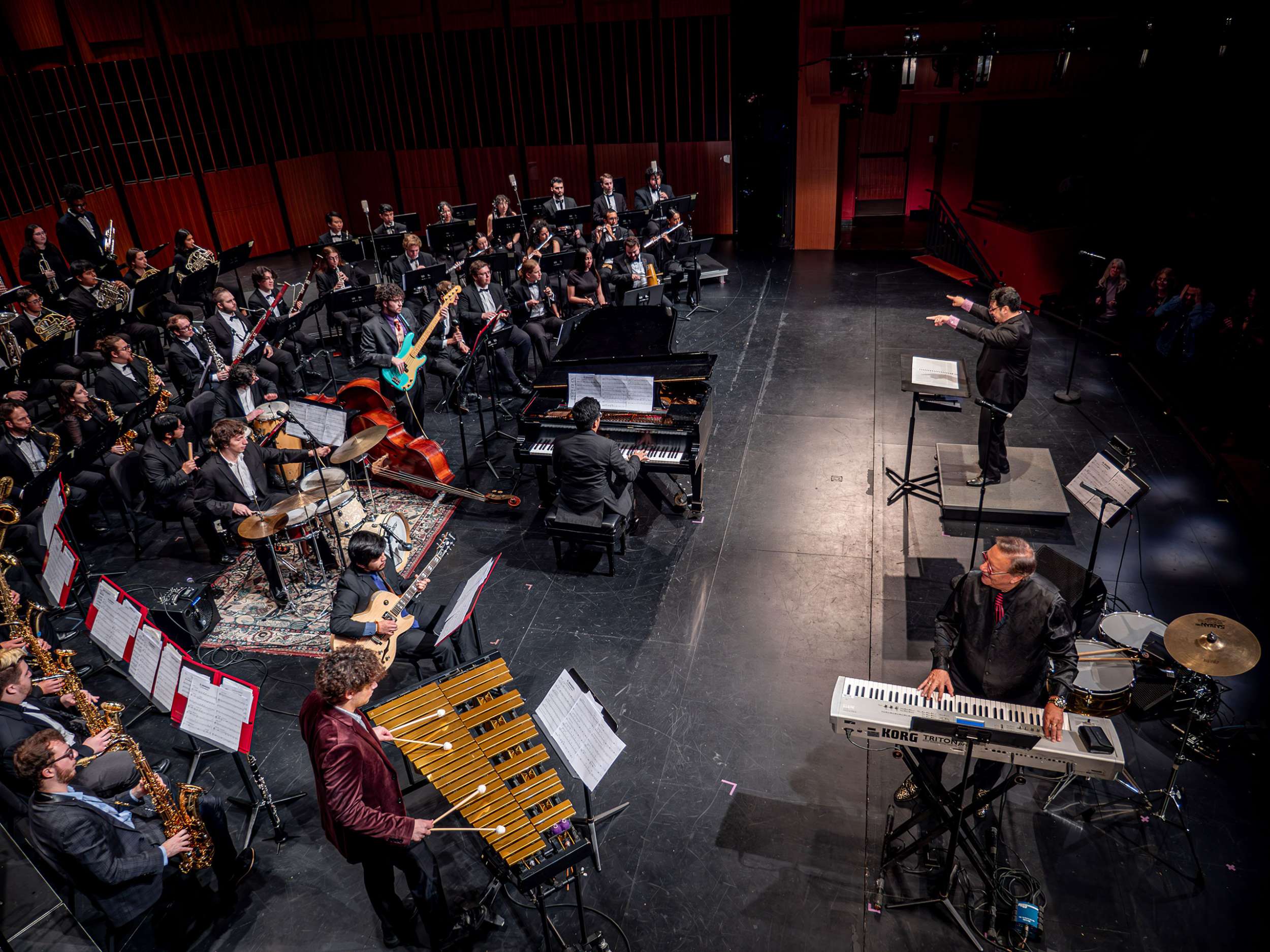 On the final day of his five-day residency, Sandoval returned to the Kasser Theater where he was joined by the University Wind Symphony for the Crawford Concert. In a rare collaboration, the orchestra was joined for two songs, including “Weekend in Tunisia,” by the Jazz Ensemble.
