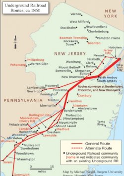 Political activism on the surface often reflects actions that are not as easy to see in the historic record, and of course one of the most powerful anti-slavery political acts during the antebellum era was the mostly invisible Underground Railroad. The Underground Railroad involved the clandestine passage of escaped slaves out of the South into the North and Canada. While there were many routes north, New Jersey had a series of passages that allowed for travel from Maryland and Delaware up to New York City. Most of the known routes in the southern part of the state converged at Bordentown leading from there to New Brunswick and to Perth Amboy or Jersey City. Isaac Hopper a Philadelphia Quaker is credited with being among the earliest freedom fighters associated with the underground railroad in New Jersey. Escaped slaves knew of him and where he lived and would turn up at his home to find refuge and if necessary legal counsel. He also identified New Jersey farmers to establish places of refuge for escapees.