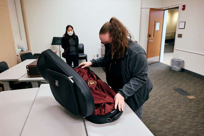 Victoria Ortega, a freshman Music Education major, opens the case and then plays her new euphonium, which was purchased for her with funding in the Cali Pathways Program.