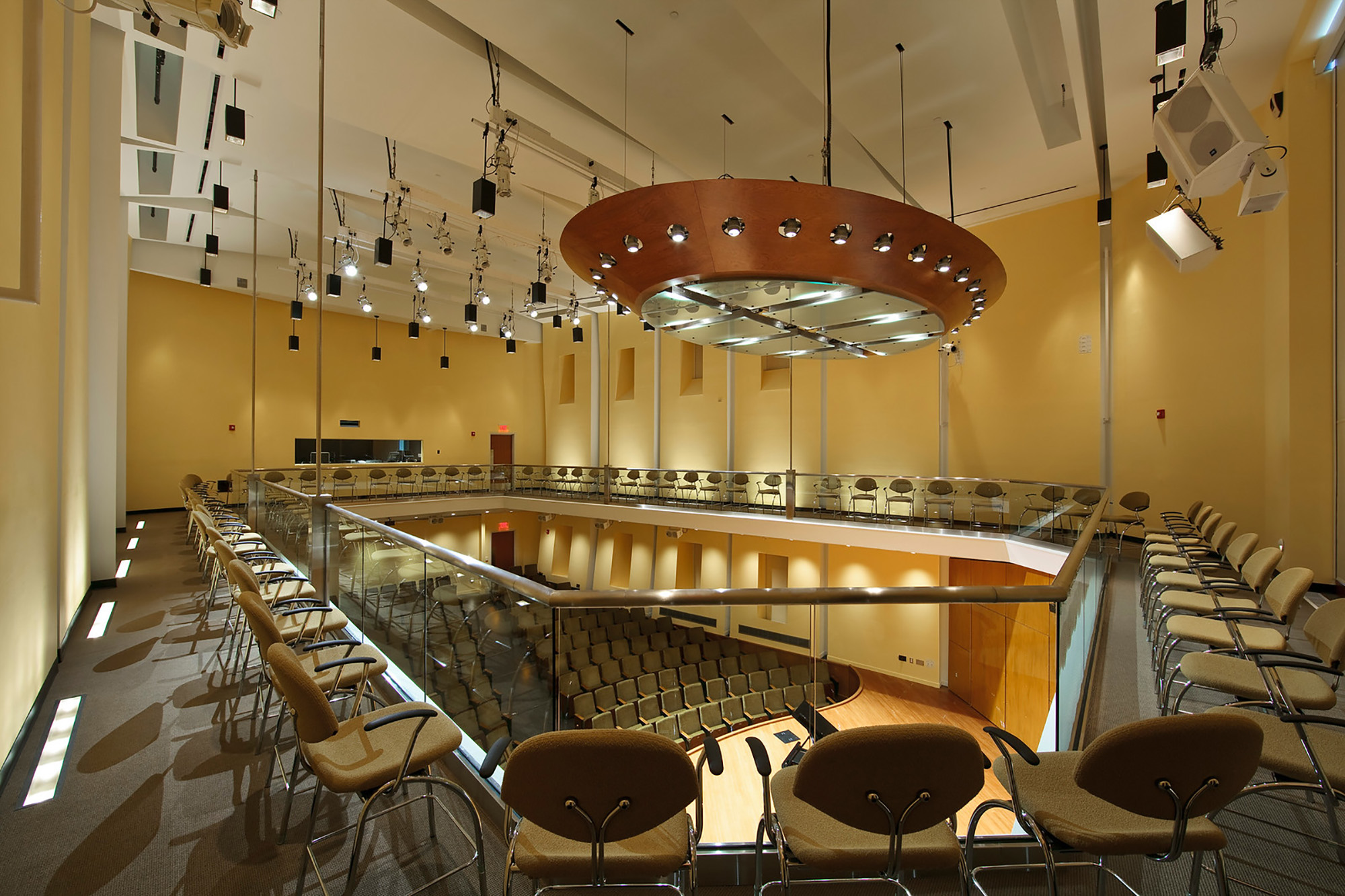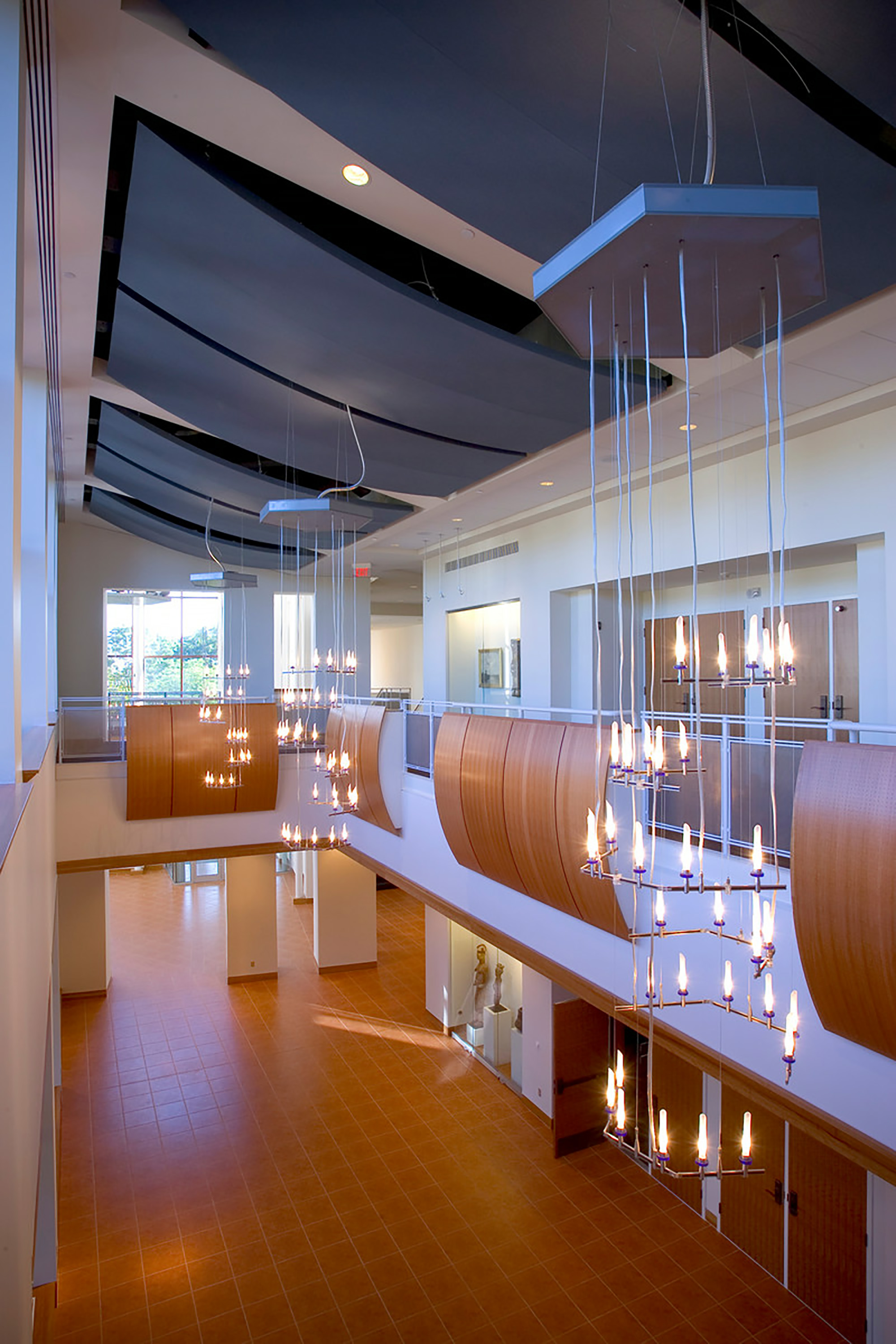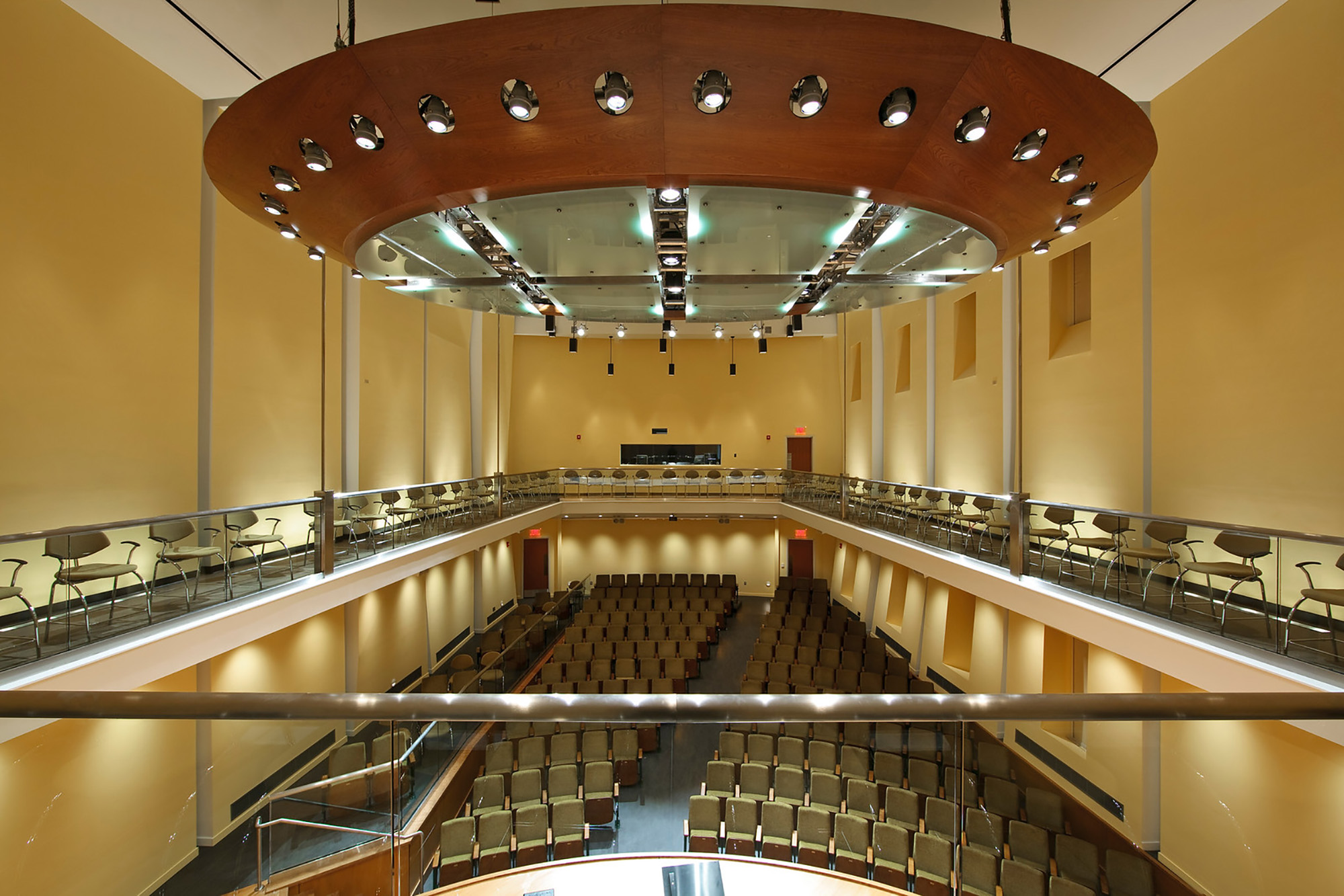 Home of the College’s Cali School of Music, Chapin Hall houses spaces for instruction and performance. Its three-story lobby allows natural light to filter to the ground floor ticket booth.