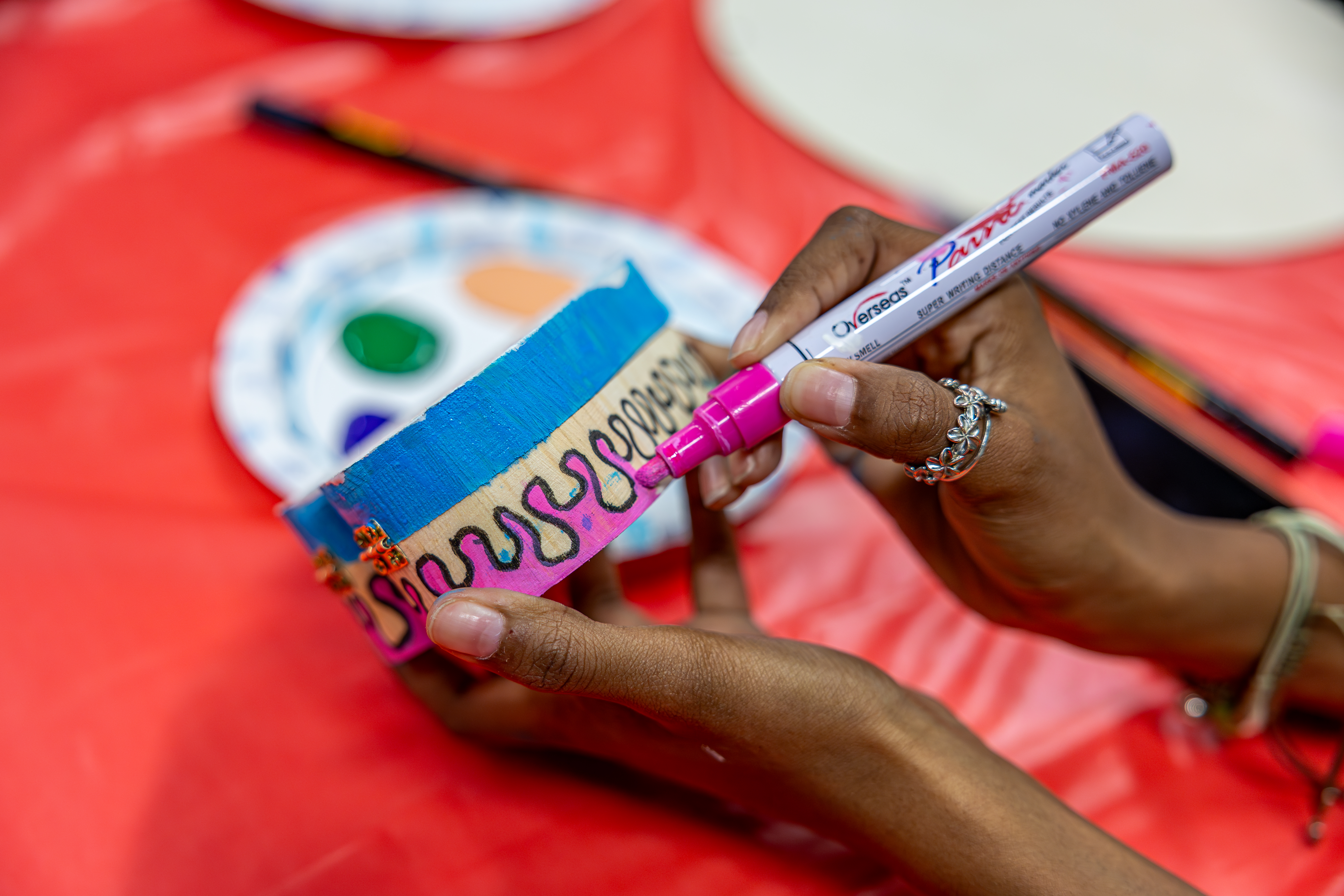 - Students decorating a canvas of their choosing with paint, glitter, and various items.