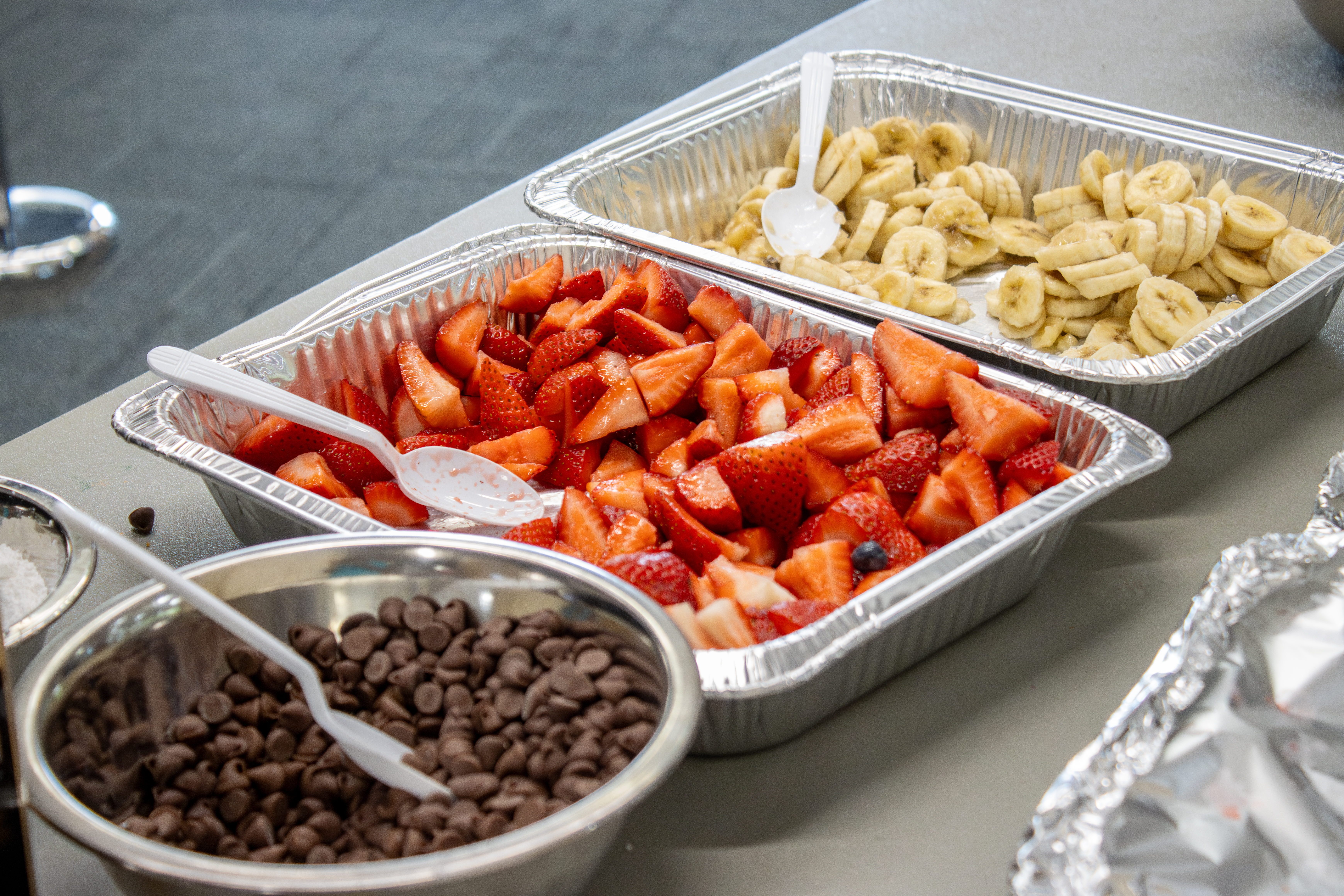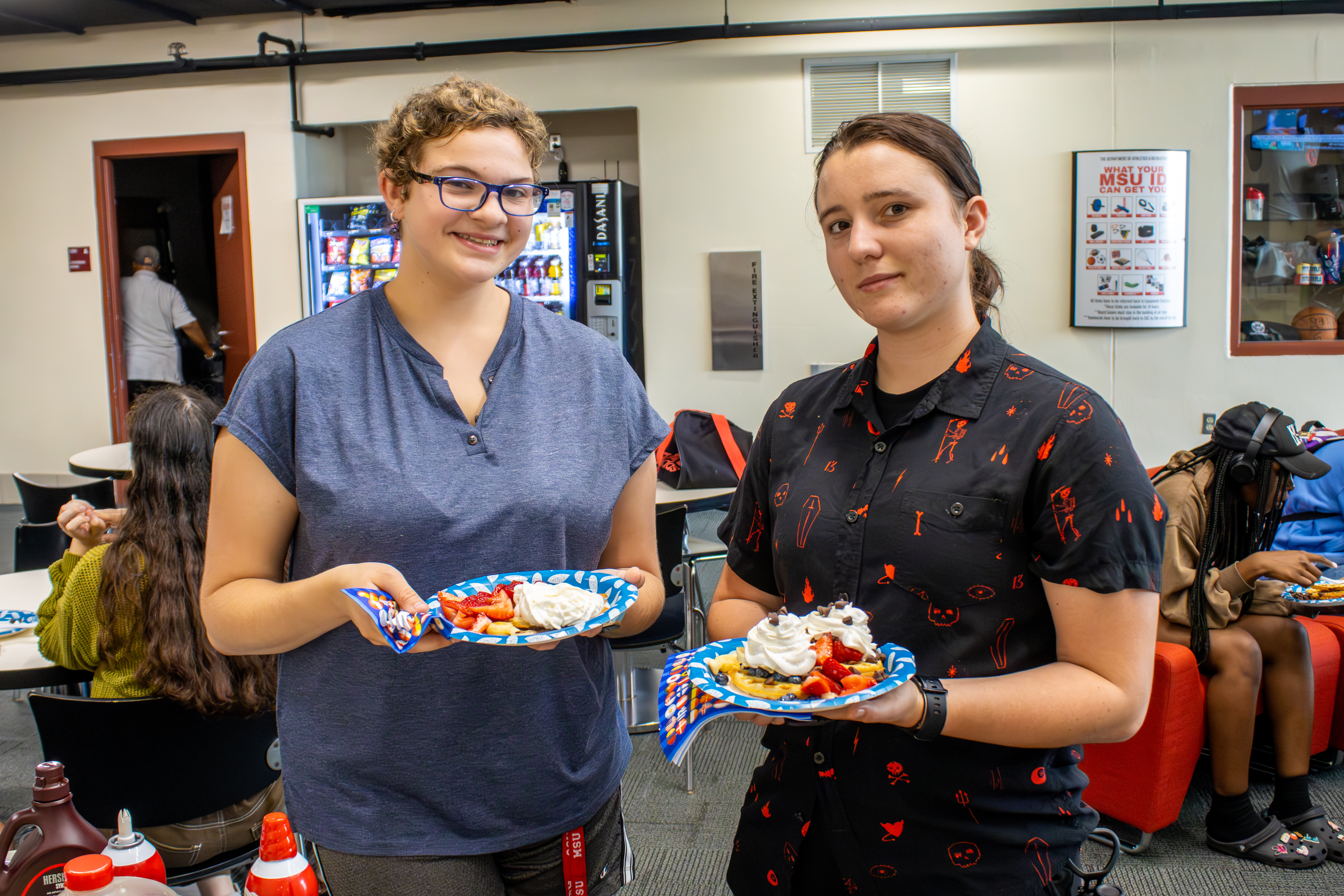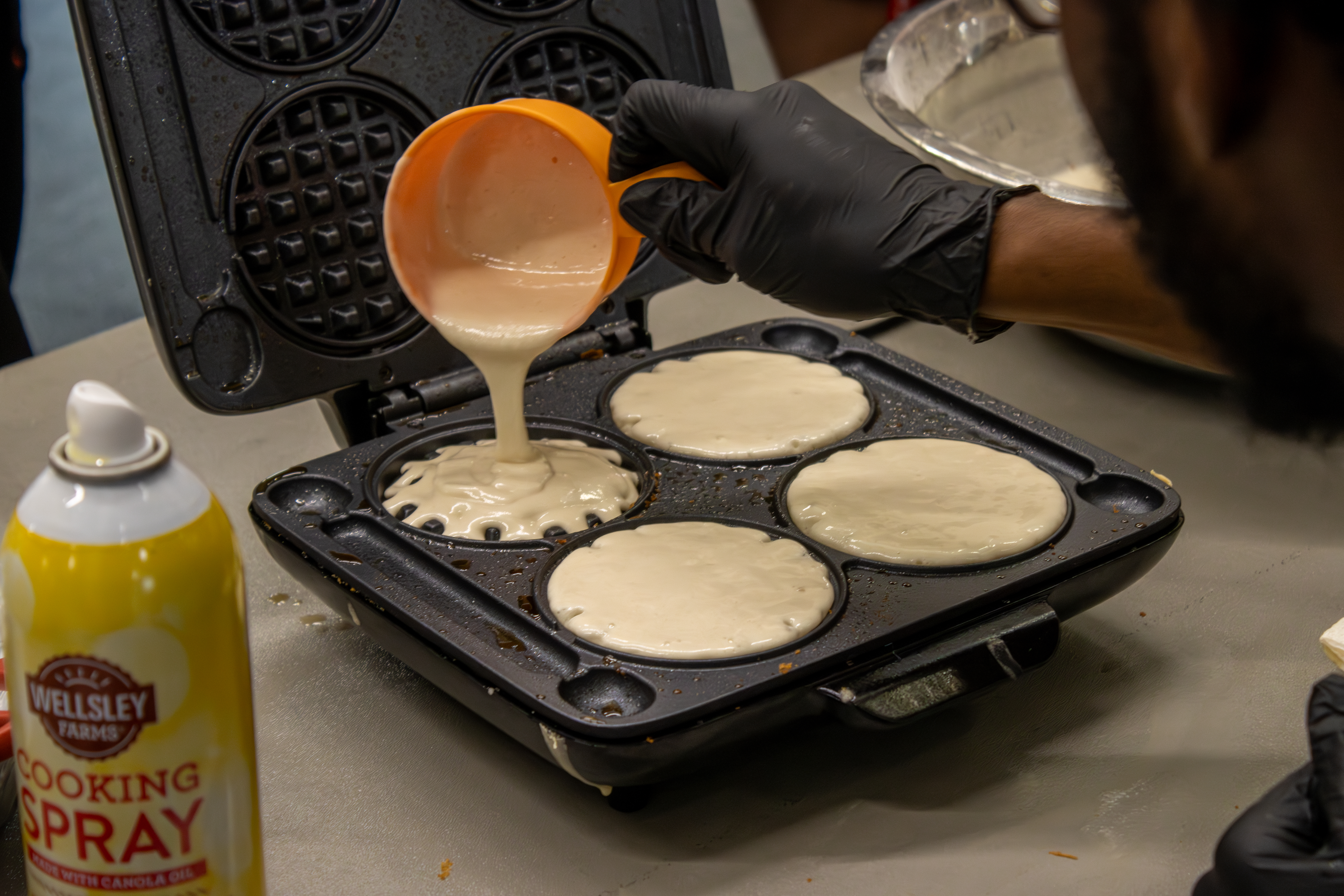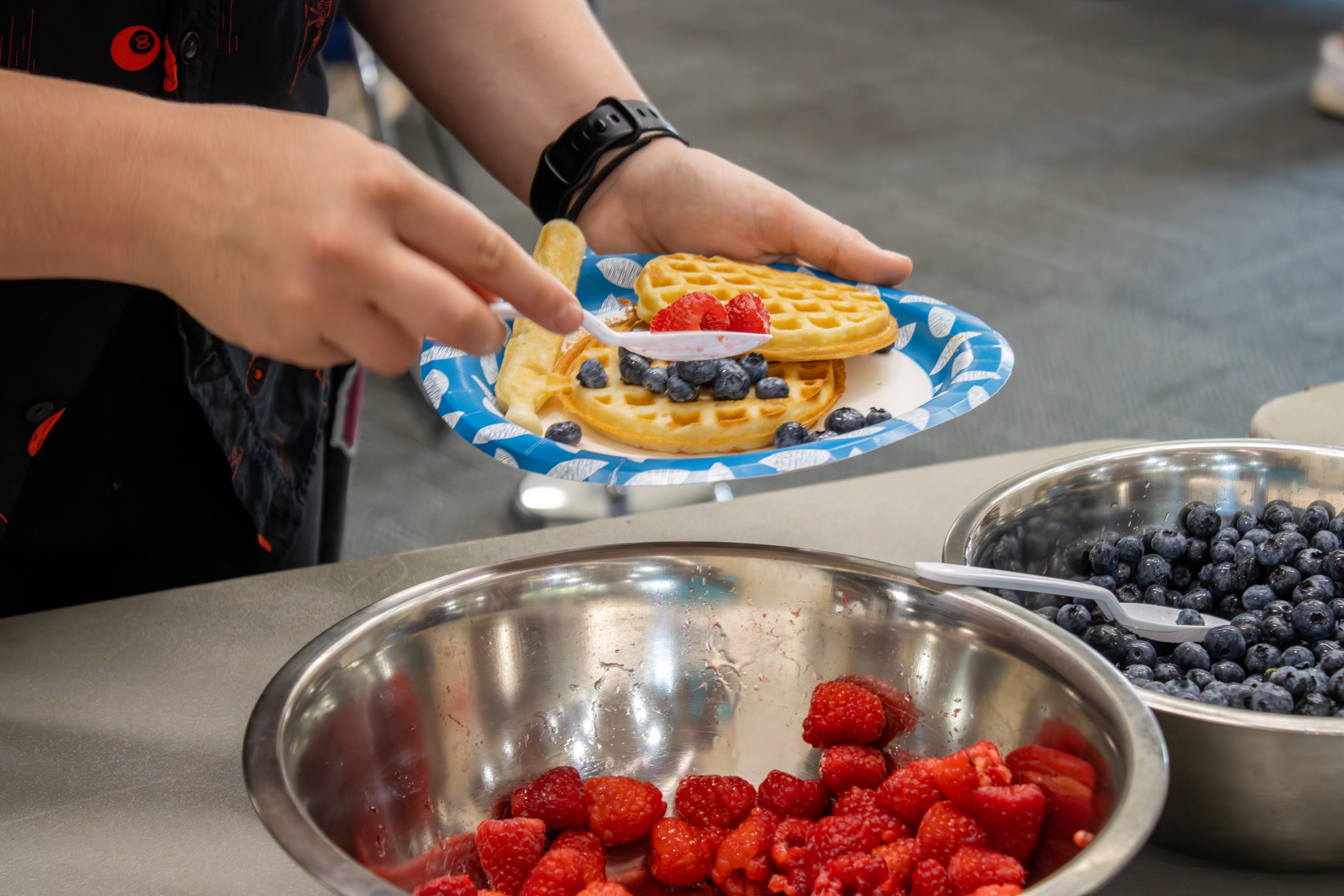 Students coming in and enjoying FREE Waffles with toppings of their choice.