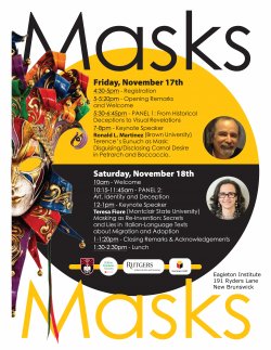 Held at the Eagleton Institute of the Rutgers’ Cook/Douglass campus, the conference included papers on a wide array of topics from masking as forging in antiquity as well as today with AI; masking as an essential and ever-evolving part of Commedia dell’Arte; masking as hiding corruption in films about Fascism and Nazism; and masking as a folk tradition revisited in contemporary environment-conscious fashion, among others. The second keynote speaker for the conference was Prof. Ronald L. Martinez from Brown University whose talk was titled “Terence’s Eunuch as Mask: Disguising/Disclosing Carnal Desire in Petrarch and Boccaccio.”