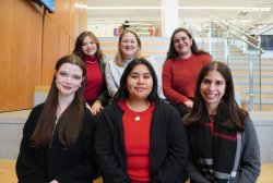 The 2025 Montclair SCM Bateman Competition team: Bottom Row Left to Right: Libby Brennan, Noelia Aguirre, Mary Lage. Top Row Left to Right: Grace Velazquez, Professor Erin Weinberg, Hallie Lippey