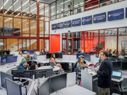 The News Lab is the headquarters – and heart – of the School’s journalism and digital media programs. This is a space that has been designed with one thing in mind – collaboration. Video, audio, on-line, print – it’s all created here 24/7 . . . and then sent out to the waiting world.