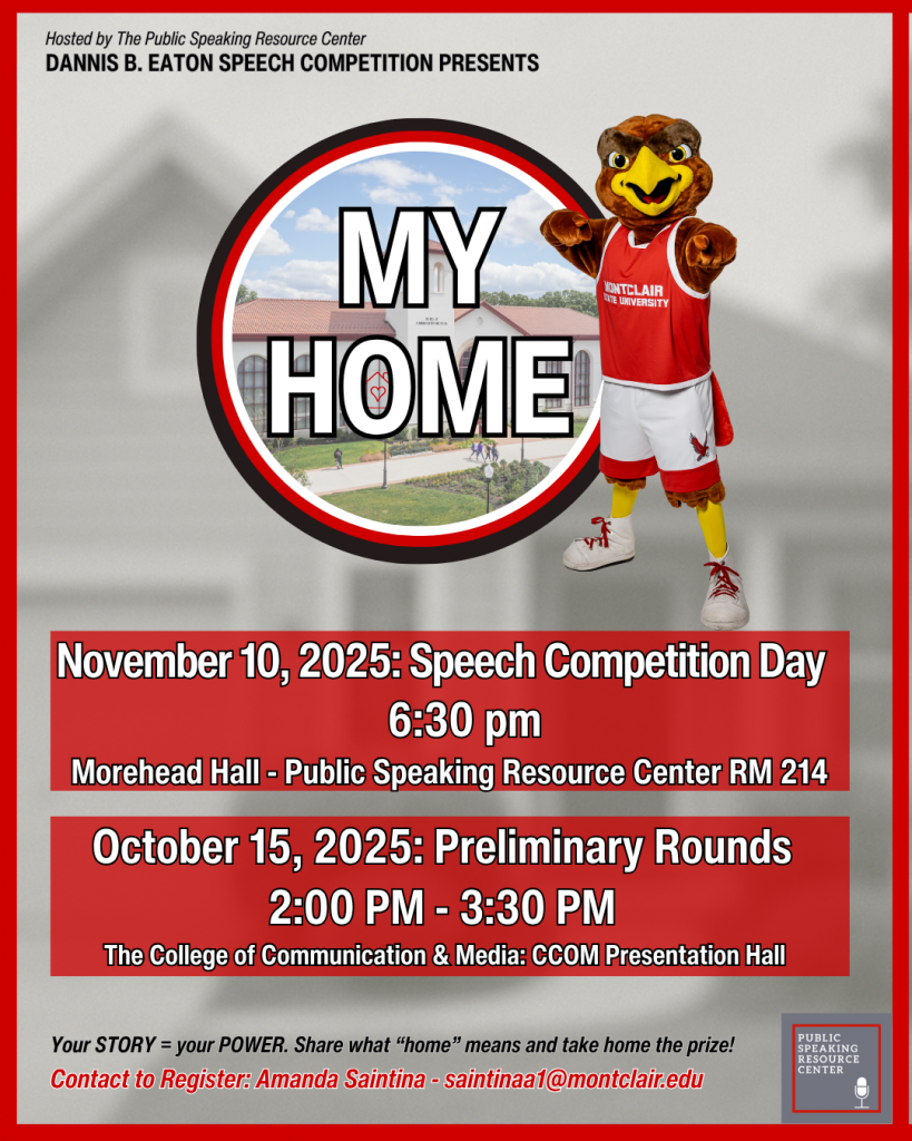 The Dannis B. Eaton Speech Competition is an annual event held by the Fundamentals of Speech Program in the College of Communication and Media. Each fall we invite the campus to address a topic that asks all Montclair State University students to ponder current events, and propose visions and solutions to the problems and questions that are confronting our society today. The topic for the 2025 competition is My Home.