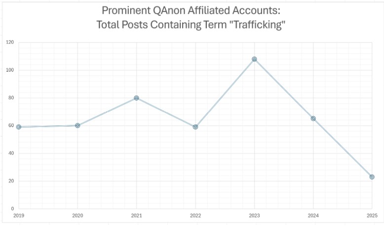 - A greater than 50% reduction in views of human trafficking posts for 2025 from all studied QAnon affiliated/adjacent accounts, indicating potential diminished interest from their respective audiences