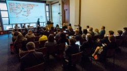 A lecture hall example with someone presenting in the front and stadium-style seating with desks.