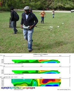 Our seismic system consists of 48 geophones to detect the seismic waves, two 24-channel Geometrics Geode seismometers to record and digitize the geode signals, and a rugged field laptop to control the system and process the data.