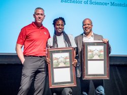 Vice President for University Facilities Shawn Connolly announced Motor Vehicle Operator Yvelices Nunez as the 2018 recipient of the John W. Dennis Leadership Award (left). A 13-year employee of the University, Ms. Nunez received an overwhelming percentage of the nominations in recognition of her commitment to the University, her excellence, and the positive, upbeat manner she employs in her daily job performance. The highest honor the division may bestow upon an employee, this award is named in honor of John Dennis, a former Locksmith and IFPTE Local 195 President who passed away in 2012, having rendered 40 years of service to Montclair State. This year’s award was presented in absentia to Ms. Nunez’ children, Chrisbell, Christhalie, and Brian.