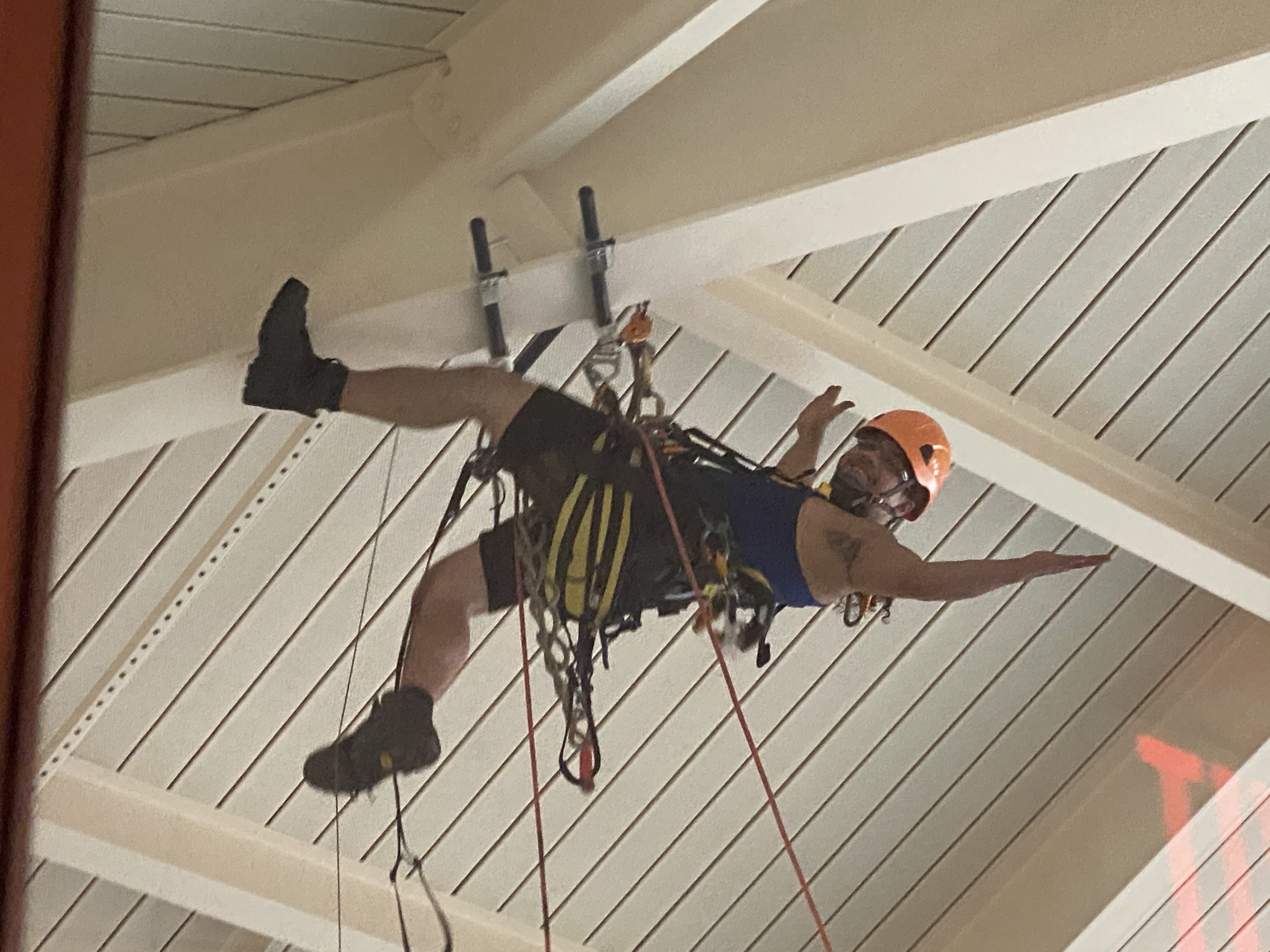 - [caption id="attachment_209773" align="alignnone" width="300"] Worker suspended via ropes installing new lighting over Rec Center pool.[/caption]