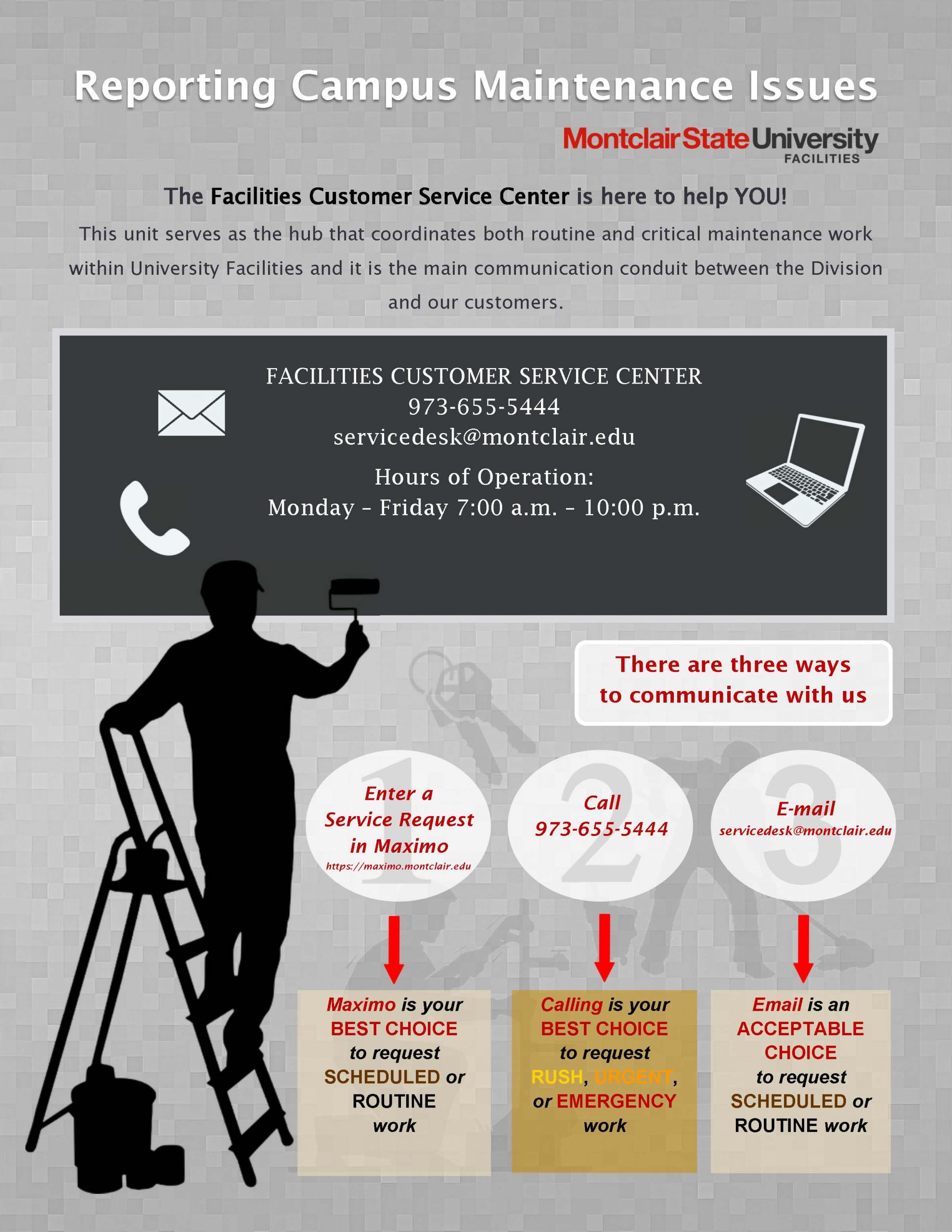 The Facilities Customer Service Center (FCSC) is our customers’ primary point of contact for all service requests and general inquiries. It is staffed Monday – Friday 7:00 a.m. – 10:00 p.m. Our Call Center picks up all calls after hours, including weekends.