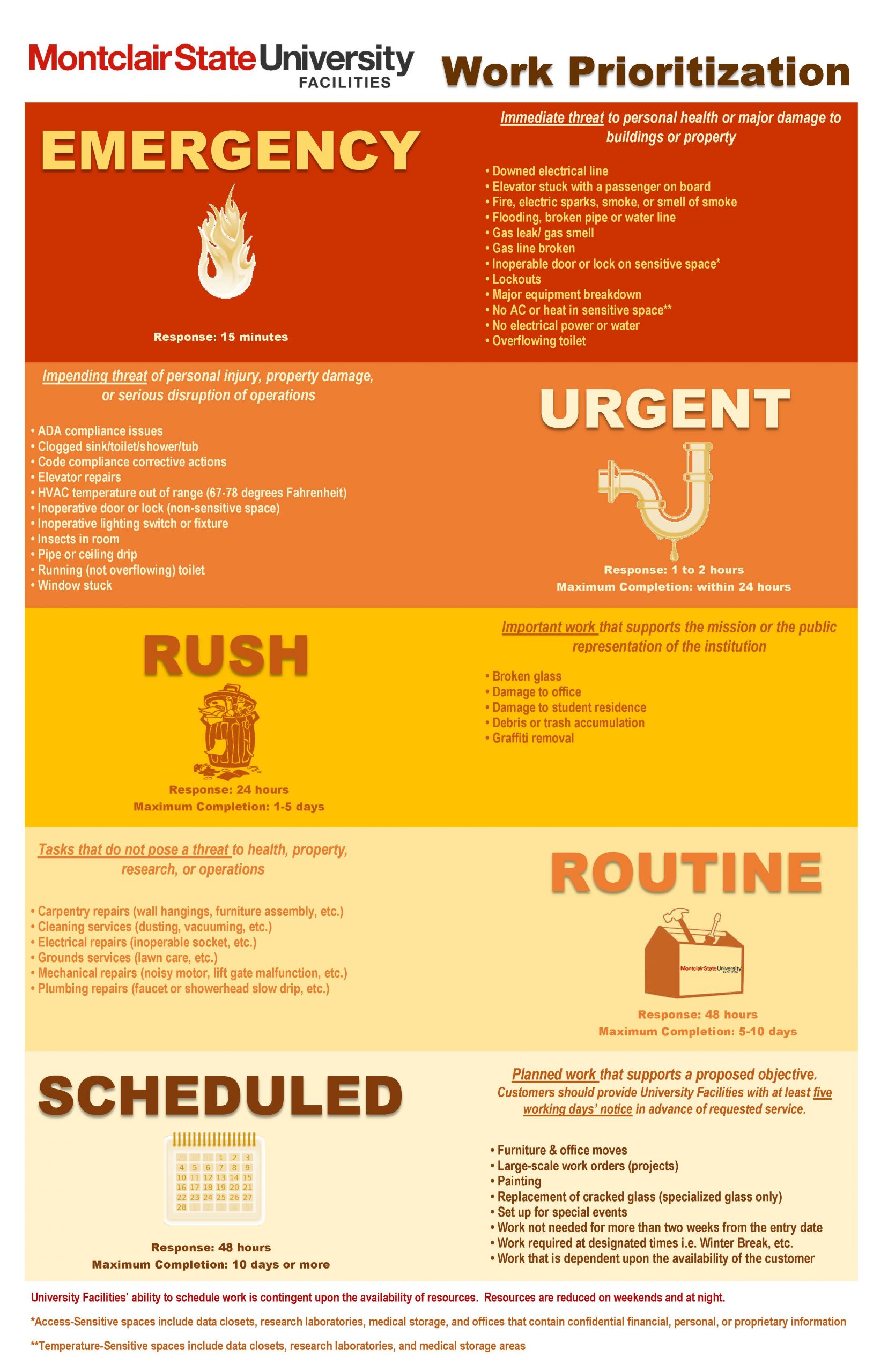A priority level is assigned to each request using APPA Facilities Standards and the details you provide. Please include photos, documents, or any previous history of work for clarity. Please review priority levels and expected response times before following up with inquiries to the FCSC. Status and technician notifications are also available in several ways: