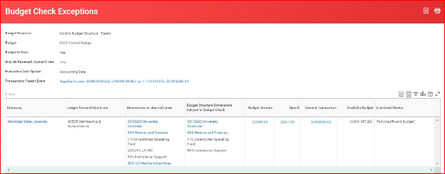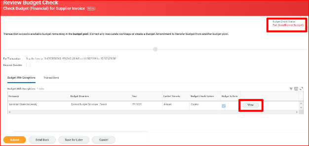 1) Click the Review button to drill into the request in order to find the issue. In the upper right corner, the budget status displays.
