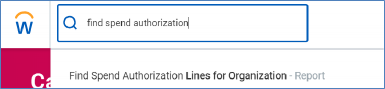 1) Enter Find Spend Authorization into the Search bar and select Find Spend Authorization Lines for Organization – Report from the search results.