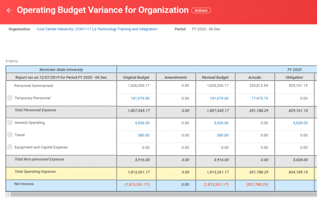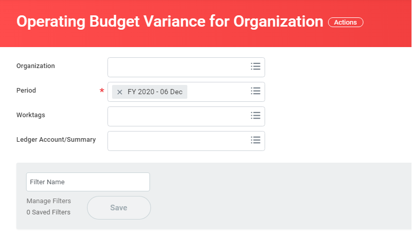 • In the Search field, enter Operating Budget Variance for Organization (R002) to find and run the Budget Report.