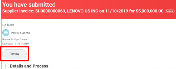 If the system finds an issue with the budget versus your request, a “Review Budget Check” action and Review button displays on the screen, once the request is submitted. An item will also be sent to your Inbox, Actions tab. NOTE-This request will NOT be sent to the approver for review if there is an issue with the budget.