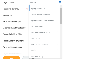 2) In the Organization field, select the Prompt icon and My Organizations to view a list of those cost centers associated to you and select the appropriate cost center.