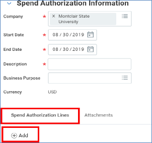 6) Under the Spend Authorization tab, select the Add icon to add additional lines. To delete a line, click the Minus button associated to the line.
