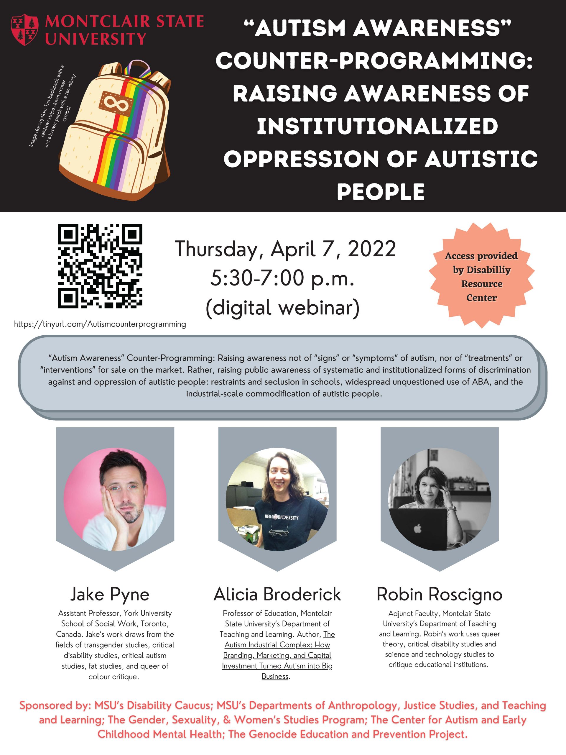 “Autism Awareness” Counter-Programming: Raising awareness not of “signs” or “symptoms” of autism, nor of “treatments” or “interventions” for sale on the market. Rather, raising public awareness of systematic and institutionalized forms of discrimination against and oppression of autistic people: restraints and seclusion in schools, widespread unquestioned use of ABA, and the industrial-scale commodification of autistic people.
