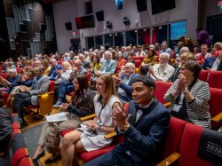 It was an evening to give back to those who give, as more than 180 guests gathered on May 8 for Montclair State University’s Donor Celebration, held in the School of Communication and Media. The festive event featured a program in Presentation Hall followed by a reception in the lobby, marked by views of the New York City skyline.