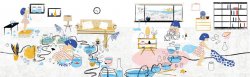 Once there, the girl tries to replicate the vastness of the fish’s environment by creating an artificial habitat in her living room. She bustles around her home, industriously filling pitchers, pots, and bowls with fresh water and connecting them with elaborate tubing so that the fish can swim between them. Eventually, the network is complete. Though the effort is makeshift, she has created a human-sized ‘aquarium’. The girl stretches out triumphantly in the center of the habitat, an overflowing kiddie pool, with the little fish by her side. Keen readers will recognize the angle of the image, as well as the girl’s pose and expression, directly parallel those of her daydreams. Perhaps she has finally fulfilled her dreams of living amongst fish.