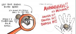 The narrator of I’m Trying to Love Spiders documents several forays into spider-loving, exploring spiders’ venerable history, their cleverness, their (inadvertent) service to humankind, their intricate bodies. The reader learns a lot about spiders, going along on this emotional journey. From time to time, the sheer ickiness of spiders overcomes the narrator’s noble aspirations, and the story is interrupted by “Splat.” After maybe the fourth “Splat,” emotional victory is achieved, with a last “Splat” reserved for a cockroach – the next creature on the “learning to love” list.
