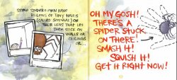 It is also extremely delicate territory. The narrator in Barton’s books is not trying to override or reprogram emotion. Rather, Barton models a respectful dialogue – with oneself: “Does this change how I feel?” Splat. “Evidently not. Ok, I’ll try another approach.” This way of thinking is internal philosophical dialogue, from which one learns about love and hate, about oneself, and, along the way, about spiders. In the larger picture, this delicacy of approach is admirable, because, in many contexts, it is important to encourage children to trust their feelings. These often contain important insights (about strangers, creepy family members, dangerous situations) and they are, right or wrong, the origins of sustained action. A person who loves butterflies, or hates bullying, can build a whole life around that intuition. A book that simply debunked initial feelings (“Here’s why you should like spiders”) would be the opposite of respectful and the opposite of philosophical. Barton writes in a whimsical, exploratory way, and so models a promising way of working with negative emotions.