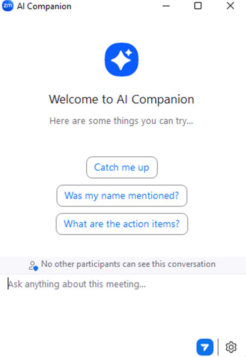 - In Meeting Chat Companion: Use Zoom AI Companion features to inquire about meeting information. Some questions you can ask Zoom AI Companion are “Was my name mentioned?”, “ What are my action items?”, “Was a date agreed on?”