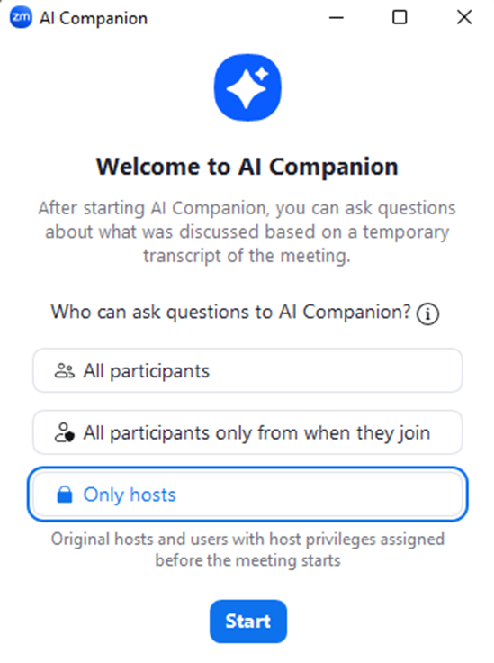 A new pop-up window will appear. Close this window if you don’t have any immediate questions to ask. You can always return to the window by clicking the Zoom AI Companion icon in the Zoom toolbar again.