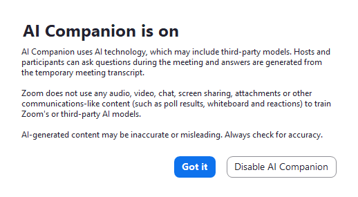 - Be aware of your audience and the context of your meeting when choosing to use AI Companion.