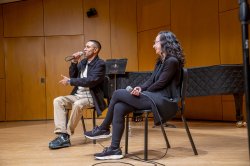 Dr. Teresa Fiore (Inserra Chair, pictured above) embraced the program as part of a mini-tour Amir presented in the states of NJ, NY and PA, and designed it so that it would be able to reach students well beyond the specific field of Italian, leveraging the multi-layered meanings of Amir’s raps to address anti-racism and the inclusion of diverse voices. “I have organized almost one hundred programs on campus over the past decade or so” – she remarked – “and hosted the most diverse artists fully committed to their art, but I have rarely seen such sustained dedication in the course of a non-stop marathon of eight hours on campus during which Amir met informally with faculty to plan the program, guided students through the creation of rap lyrics, shared stories with radio hosts and student journalists as part of engaged interviews, and then rapped on stage for over an hour getting the whole audience standing and singing along. It is a testimony to an agenda which is artistic and political at once, and that foregrounds human relationships and lived experiences.”