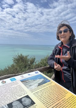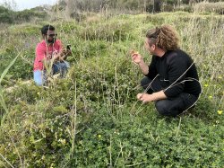 Durante il sopralluogo, la Prof.ssa Fiore e il Prof. Nathan hanno avviato importanti conversazioni o completato visite mirate della Scala dei Turchi. La Prof.ssa Valeria Scavone (Architettura, Università di Palermo, Polo di Agrigento) ha fornito materiali relativi alla rimozione degli eco-mostri nella zona della Scala dei Turchi (studio vincitore di una menzione speciale) e al rapporto geografico-antropologico tra Realmonte e la sua costa. Gli educatori ambientalisti Marcello Mira and Antonino Dinolfo hanno proposto un itinerario a piedi incentrato sulla flora costiera che riflette il continuo intrecciarsi di acqua marina, vento e sabbia/terra nella definizione di una macchia mediterranea importante per la salvaguardia dell’ecosistema, così come per la dieta umana e animale. Il Prof. Agostino Tomasello (Biologia marina ambientalista, Università di Palermo) ha condiviso il suo lavoro sul ruolo della posidonia (vedi articolo), una pianta acquatica che funge da barriera di difesa del litorale e che nel sottofondo interagisce con i molluschi per assicurarsi una crescita stabile. Una seconda visita alla Scala dei Turchi, questa volta con il Prof. Antonio Caruso (Geologia e Paleontologia, Università di Palermo) e la Prof.ssa Vincenza Forgia (Archeologia, Università di Palermo, Polo di Agrigento), ha portato l’attenzione sull’affascinante storia geologica della zona dove si trova il famoso chiodo d’oro che indica il punto di passaggio dal piano messiniano a quella zancleano (vedi articolo), e dove abbiamo osservato zone di insediamento antico, non lontano da quello di epoca romana presso la Villa, a sua volta adiacente a un bunker risalente alla seconda guerra mondiale. Appunto, la straordinaria stratificazione di questo sito naturale che sarà raccontato nel sito-mappa digitale.