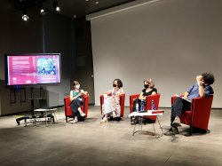 Presentazione del libro all’Università di Torino (15 luglio 2021): da sinistra, Eva Allione (traduttrice), Teresa Fiore (autrice), Maddalena Tirabassi (co-presentatrice) e Francesco Pongiluppi (organizzatore).