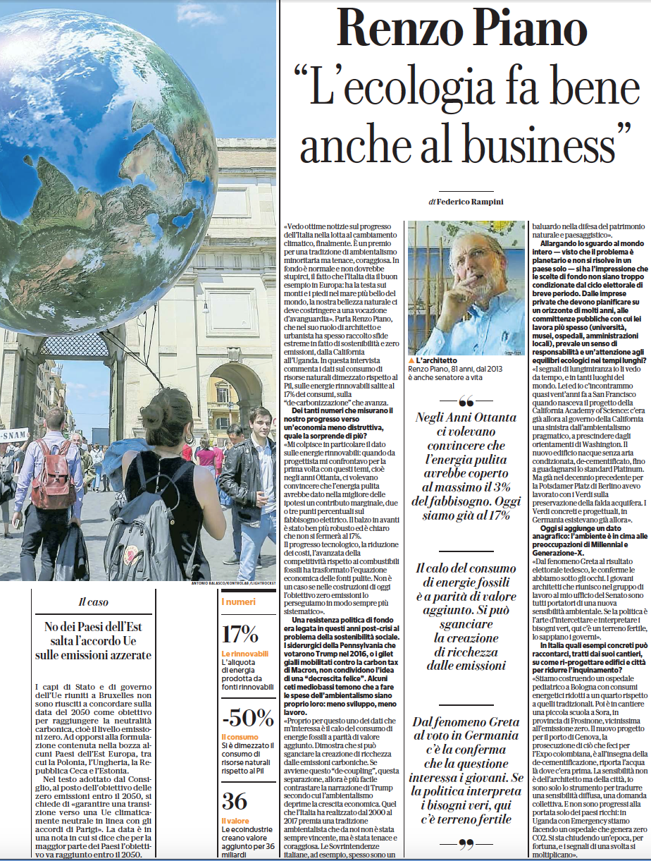 Renzo Piano “L’ecologia fa bene anche al business” (Repubblica.it; June 21, 2019; part II – article in Italian)