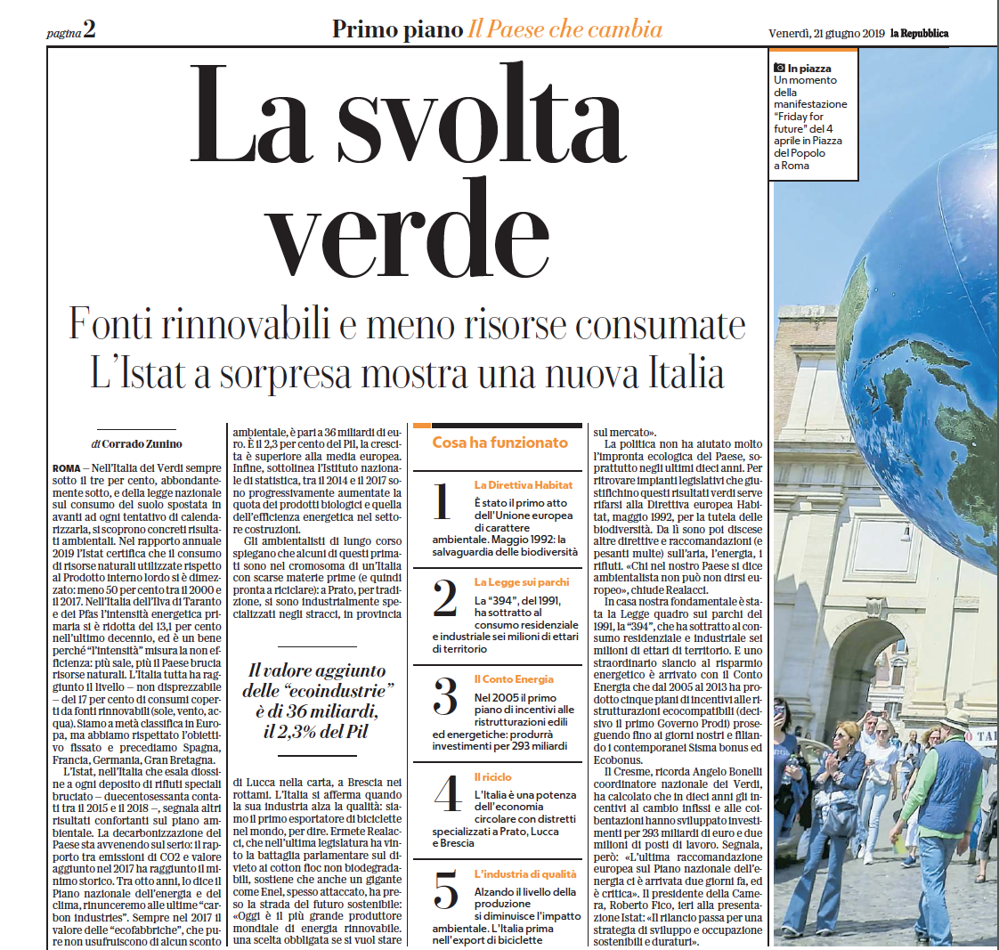 Il paese che cambia. La svolta verde (Repubblica.it; June 21, 2019; part I – article in Italian)