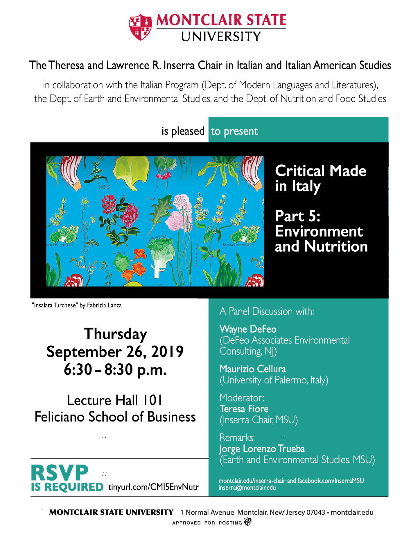 - Organized and sponsored by the Inserra Chair in Italian and Italian American Studies at Montclair State University, in collaboration with the Italian Program (Department of Modern Languages and Literatures), the Department of Earth and Environmental Studies, and the Department of Nutrition and Food Studies at Montclair State University.