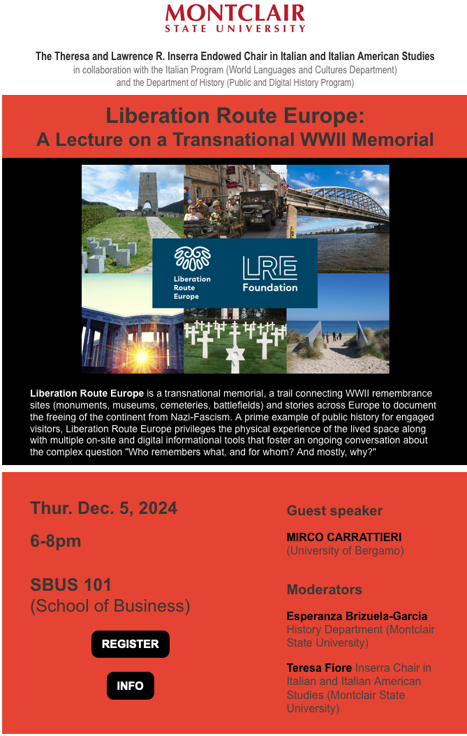 Organized and sponsored by the Inserra Endowed Chair in Italian and Italian American Studies in collaboration with the Italian Program (Department of World Languages and Cultures), and the Department of History (Public and Digital History Program) at Montclair State University.