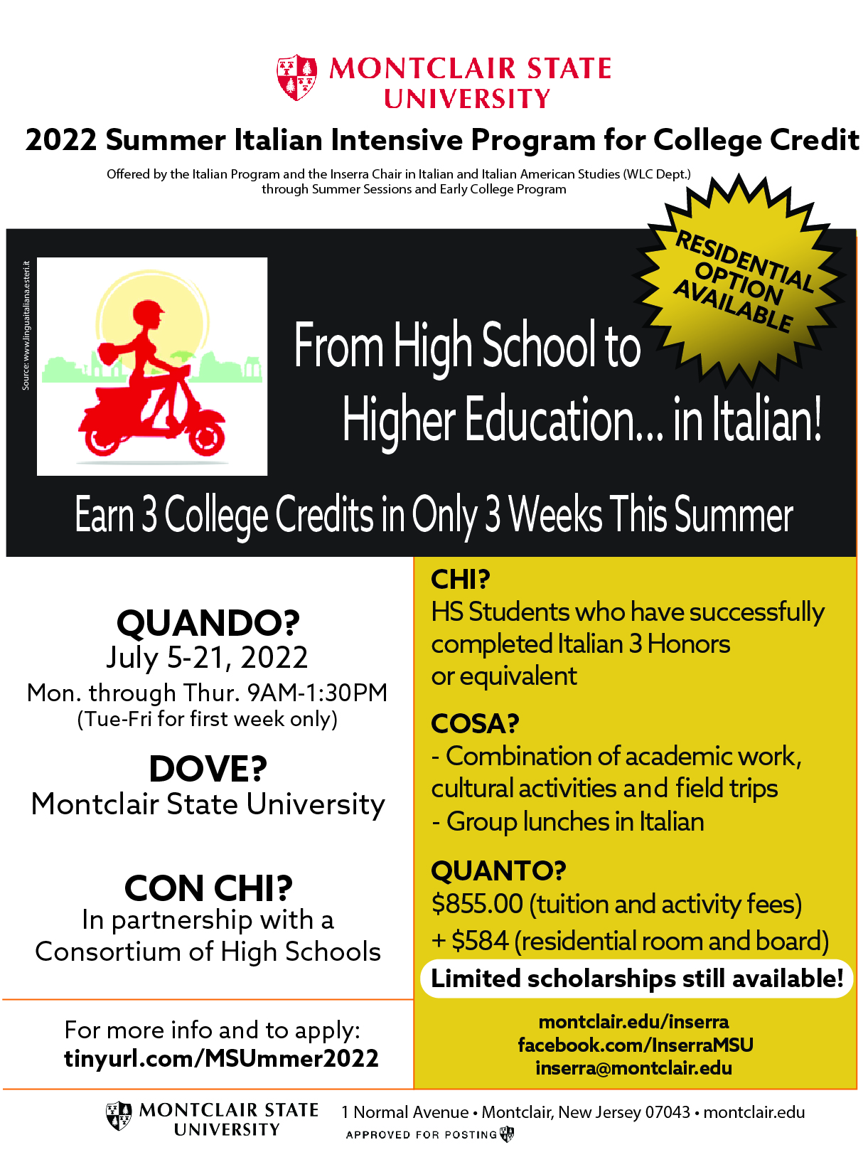 This one-of-a-kind program designed for high school students on a university campus is available at Montclair State in an intensive summer format, including guest speakers and off-campus tours. In just three weeks, it prepares students to move with confidence from Italian 3 to an AP or advanced Italian class, while granting 3 college credits at a very affordable price. Offered for four years (2017, 2018, 2019 and 2021 – COVID imposed a hiatus in 2020), the program by now represents a continuous service for high school students as well as recent graduates of New Jersey and the Tri-State Area interested in consolidating their learning from the past year and getting ready for their future university experience.