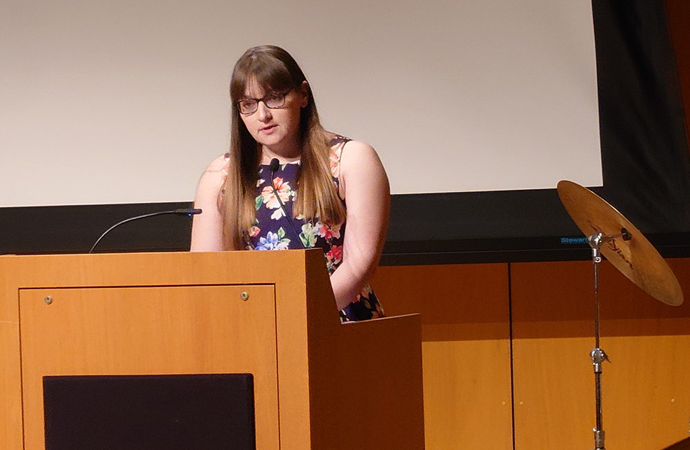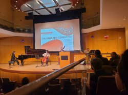 Prof. Scott Richards announced the recipient of the Outstanding Undergraduate Composer Award as Adrianna Viera, followed by Dr. Aaron Helgeson recognizing the Outstanding Graduate Composer Award as Kalden Alexander and Outstanding Undergraduate Composer Award as Adrianna Viera. Dr. Heather Buchanan took the stage to present the Excellence in Choir awards, both for undergraduates Emma Gunther, Maya Henry, Nicholas Scafuto, and Harrison Smith, and graduate student Taylor Amato, along with the Cali School Service Award awarded to Amanda Roth.