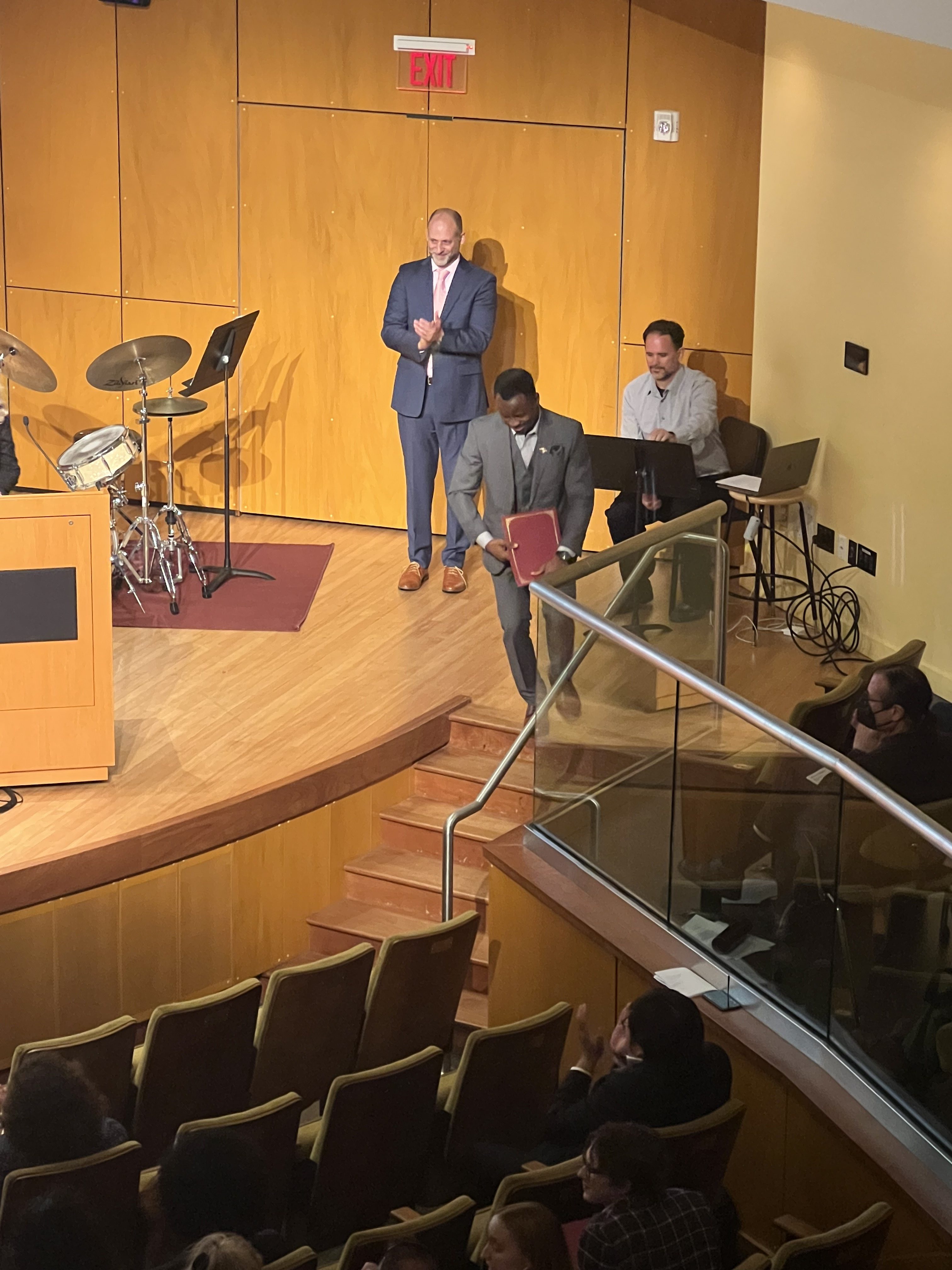 Prof. Karen Driscoll awarded the recipients of the Undergraduate Excellence in Opera to Chisom Maduakor and Graduate Excellence in Opera Award to Seungchcan Hong, while Prof. Oscar Perez acknowledged the Excellence in Jazz Award was awarded to Faith Krausman. Prof. Kathryn Lockwood took the stage to present the Oscar Ravina Talent Award to violinist Noah Stevens.