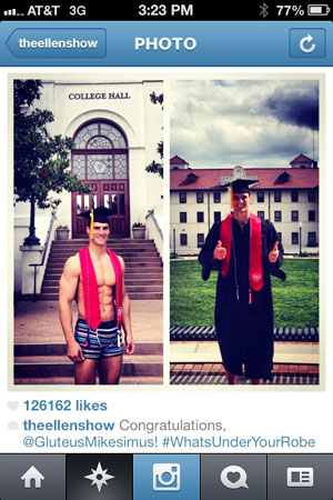 Nicknamed “Gluteus Mikesimus” by Ellen DeGeneres, Mike Wolfanger ’13, a Purple Heart-awarded veteran, was the winner of Ellen’s Underwear Model Contest. He appeared on The Ellen Show and on a billboard with Ellen in his underwear. Ellen posted this picture, tagged #WhatsUnderYourRobe, and got more than 126,000 “likes.”