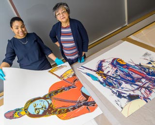 George Segal Gallery Director Teresa Rodriguez, right, and assistant Coral Payano unpack the donated Andy Warhol prints.
