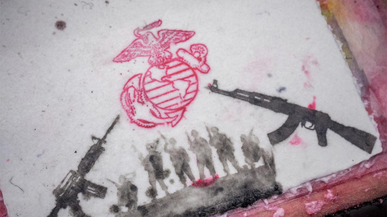 Andraca's piece, "Live by the Gun," with its depiction of a gun behind the universal red-slashed "no" sign, prompted a lot of discussion. Marines are taught to "live by the gun" and trained to kill the enemy, but as a civilian, he says, he has moved beyond that.