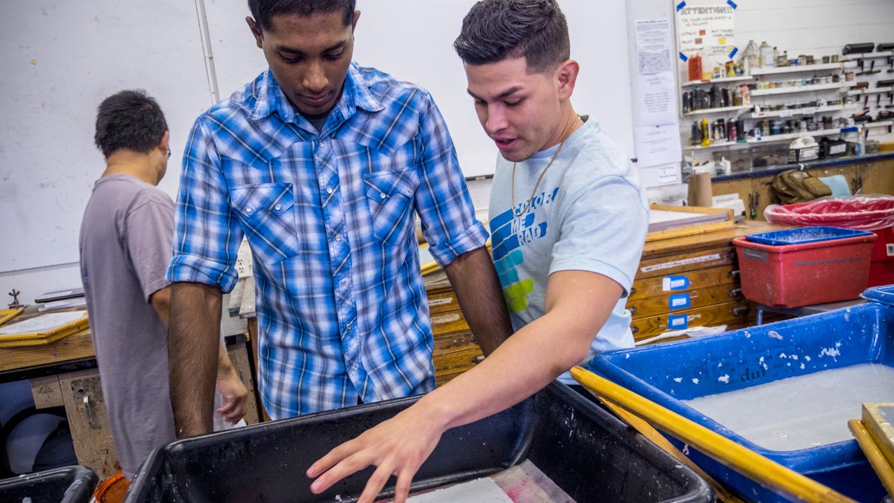 Winston Andraca helps fellow veteran and student Alvin Mathew achieve the proper saturation on the paper he made from his combat uniform. Through an ancient paper making process, the veterans are able to tell their war stories through art.