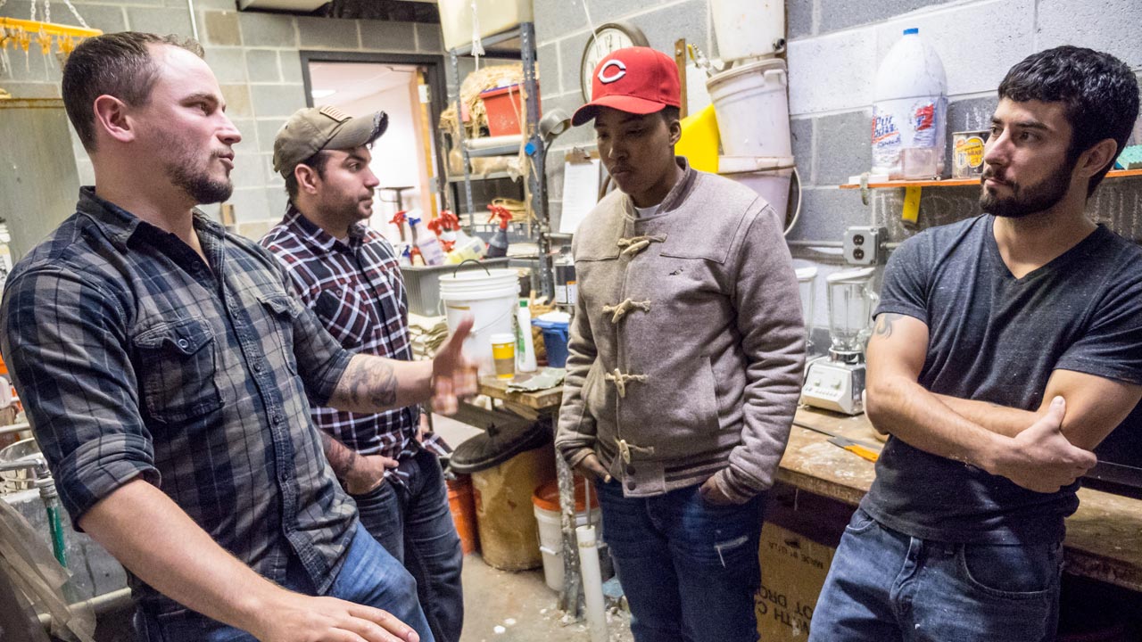 Veteran and instructor David Keefe talks with students in his fall 2014 Combat Paper course.
