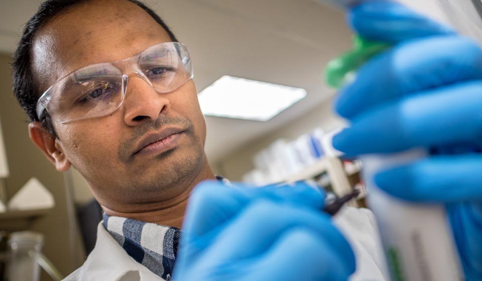 Third-year, post-doctoral scientist Sreedhar Tummalapalli works with Rotella in his lab. "It is very exciting to be able to contribute to finding an antidote for a deadly toxin that can protect our military and civilians in case of a bioterror attack," he says of working on the project.