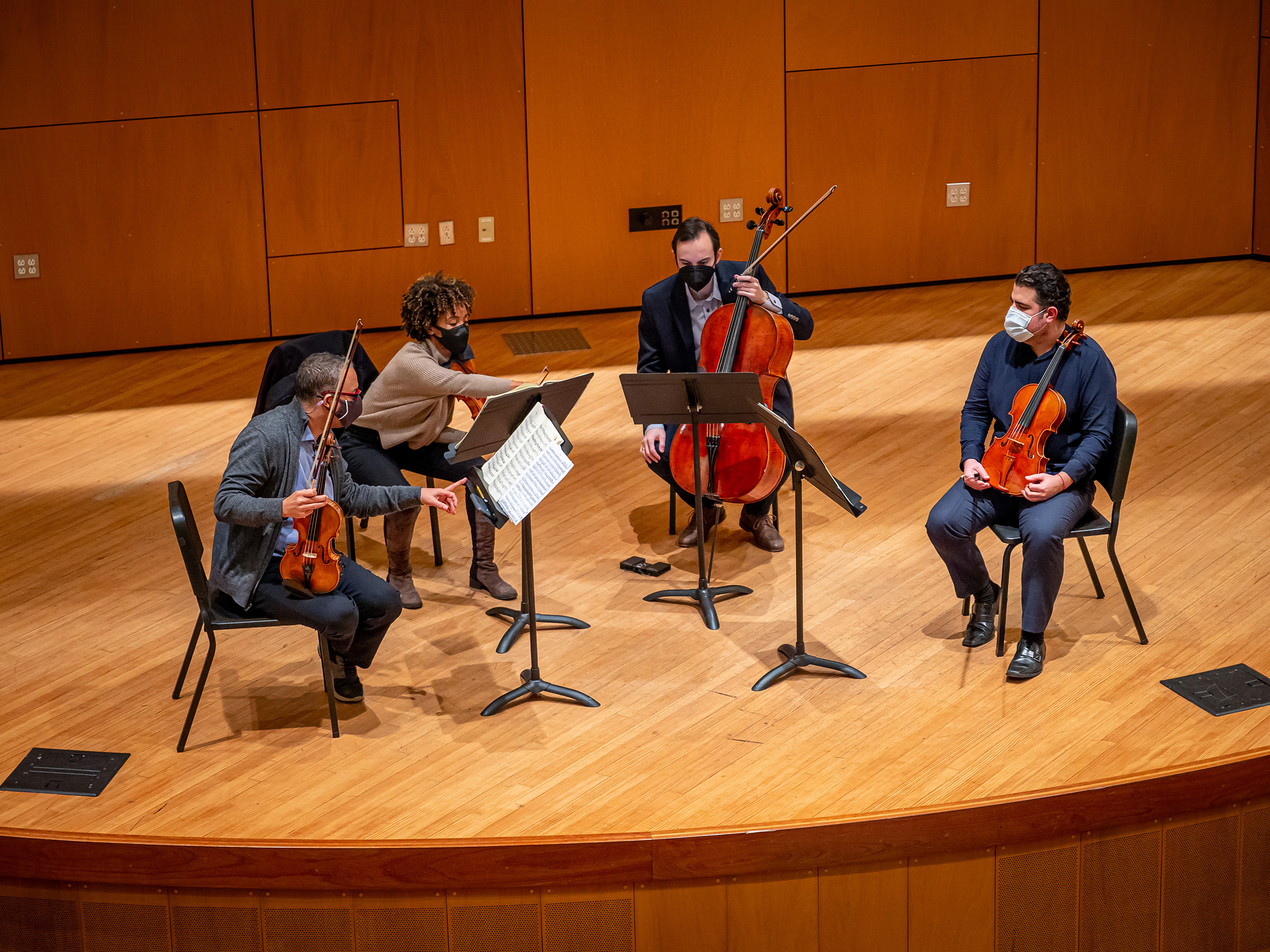 An open rehearsal in early February with the Harlem Quartet, Montclair’s quartet-in-residence, pulled back the curtain on the ensemble’s creative process as they worked through String Quartet in C Major, K. 465, "Dissonance" by Wolfgang Amadeus Mozart. The musicians worked on tempo, “leaving room to breathe” between notes, creating space for their imaginations to come through. “We have a plan, but we change and react in the moment,” Harlem Quartet cellist Felix Umansky explained.